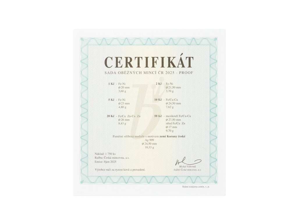 Komplet českého oběživa s ročníkem 2025 je v sadě doplněn pamětní medailí z ryzího stříbra. Tato ražba, která je dílem akademického sochaře Michala Vitanovského, je věnována historickým zemím Koruny české – averzní strana nese heraldická zvířata Čech, Moravy a Slezska a pohled do malebné krajiny; reverz předkládá českou vlajku, Svatováclavskou korunu a současné i historické hranice státu.