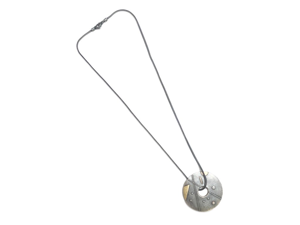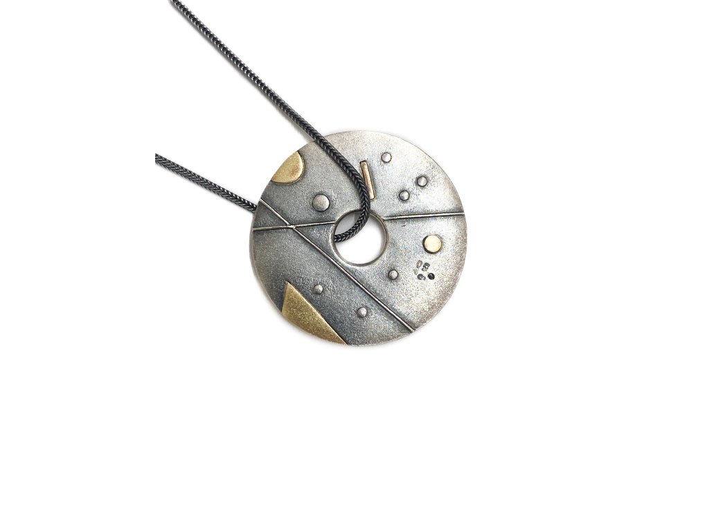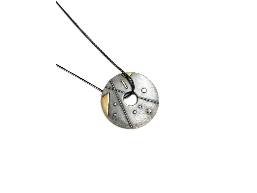 Do stříbrného kruhu jsou vložené zlaté prvky a vybroušený diamant.